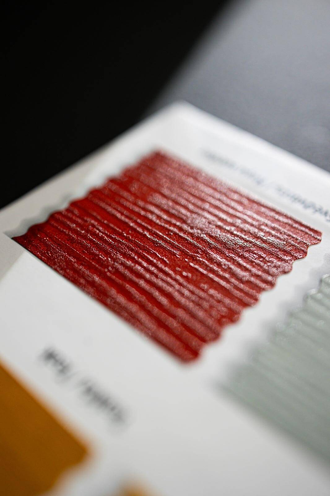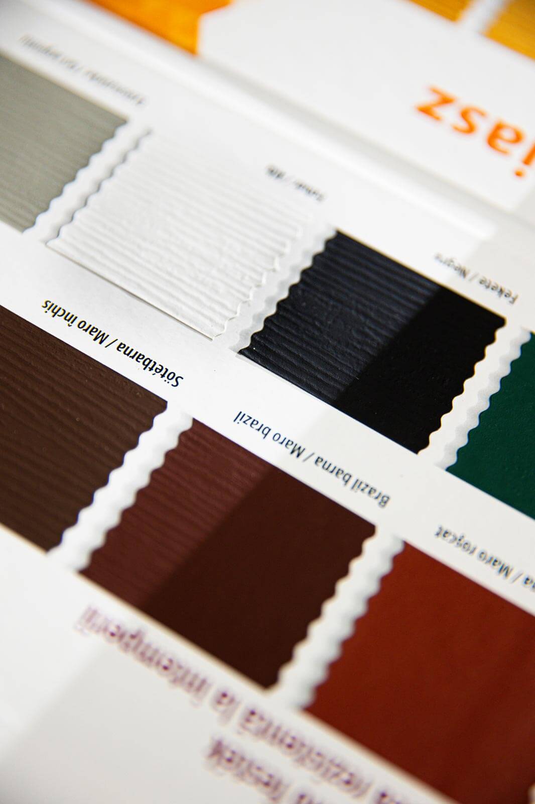 Katalozi za drvo i metal su izrađeni od sive lepenke presvučene sa štampanom i plastificiranom hartijom na kojoj se nalaze zalepljene nijanse boja. Katalozi mogu imati od dve do osam strana sa uzorcima različitih oblika i veličina.
